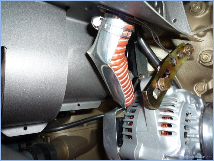 L'alternateur doit être ventilé. La prise d'air est sur la rampe avant droite. Il faut ensuite diriger le tube vers l'arrière de l'alternateur. Après plusieurs essais avec des matériaux divers, j'ai trouvé que le maintien de la gaine avec une goulotte en aluminium semblait la solution la plus appropriée. Temps de travail sur le sous-ensemble Aujourd'hui : 1h (Total : 127h) |