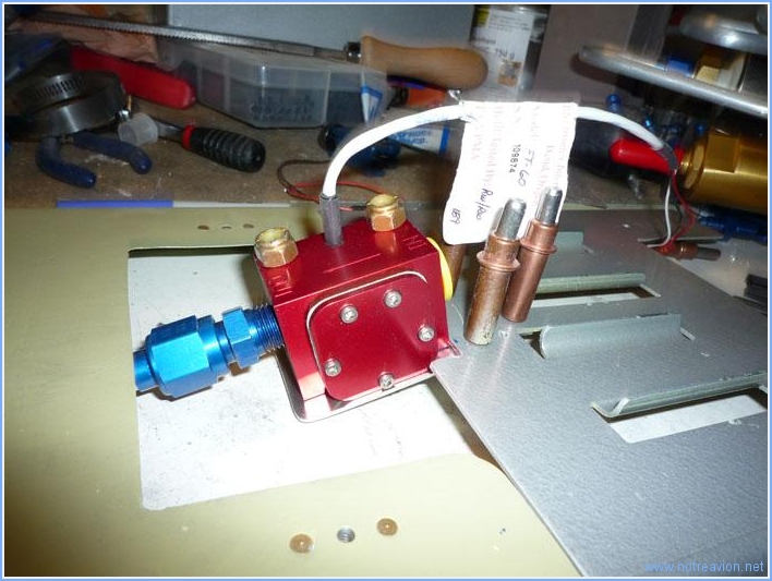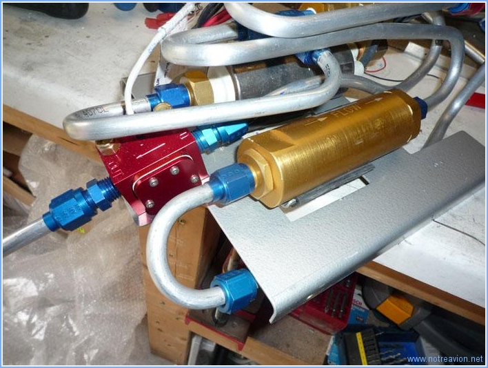I left the cowls for the time being and decided to install the fuel flow transducer. Of the three install possibilities, I ruled out the two firewall forward as I couldn't find a correct position. The third solution is to install the transducer in the cockpit, after the boost pump. This has its own problems as it is very cramped under the pump cover. This website showed an elegant solution I decided to implement. I just needed quite a lot of time to translate the pictures into an assembly I was satisfied with. This will be the transducer's final position. This is the transducer on its mounting bracket that will get riveted to the fuel pump support bracket. The outlet fits just under the front cover. Then a few tubings need to be redone. In the background is the transducer's inlet tubing, before it was running along the floor. The filter outlet tubing needs also to be redone as it was running exactly where the transducer is now. Working time on this subpart Today : 3h (Total : 210h) |