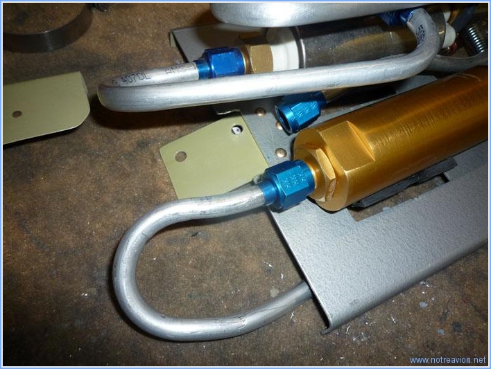 Avant d'essayer de résoudre le problème d'interférence d'un des tubes sur l'installation de la pompe carburant, j'ai peint et riveté le petit support du débimètre. J'ai ensuite essayé de fabriquer le bout de tube posant problème (celui au premier plan), mais après deux essais infructueux il a fallu se rendre à l'évidence qu'une autre solution pour le cheminement devait être envisagé. Après remise en place dans la cabine, il semble que passer au dessus du filtre plutôt que sous le support soit possible. je vais explorer cette option demain. Temps de travail sur le sous-ensemble Aujourd'hui : 2h (Total : 213h) |