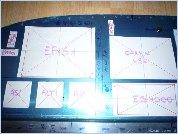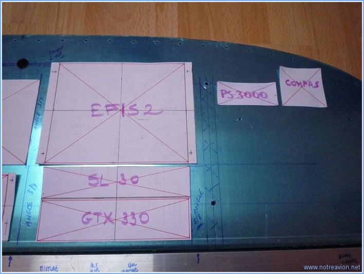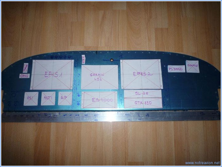 I first made some paper templates for all the instruments. The template are the size of the instruments, some include the cut-out size in red. The first instruments to install are the VHF (SL-30) and the transponder (GTX-330). Then are installed in trays that will be bolted to aluminium angles, and there has to be enough space for the right angle as there is also the panel support rib on that side. Then the EFIS 2 is positionned. I will have to shorten the right side of the canopy release handle (left upper angle of EFIS). Then lower end of the EFIS 1, Garmin 496 and EFIS 2 are aligned. The EIS 4000 is centred on the Garmin 496 and it's lower end aligned with the lower side of the transponder. Then the three instruments below the EFIS find their place, as welle as the warning lights and the trim indicators. Ths space between the EFIS 1 and the GPS will be used for the second panel support rib that has been moved from it's original position. This explains why the instruments below EFIS 1 are not centred and had to be moved to the left. I then installed the radios in their trays to see how this will be installed in the panel. The rear of the black part is supposed to be flush with the forward side of the panel. I draw some lines to be able to align the trays during the support angle fabrication. Working time on this subpart Today : 3h (Total : 24h) |