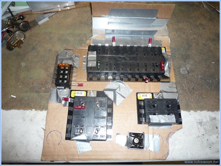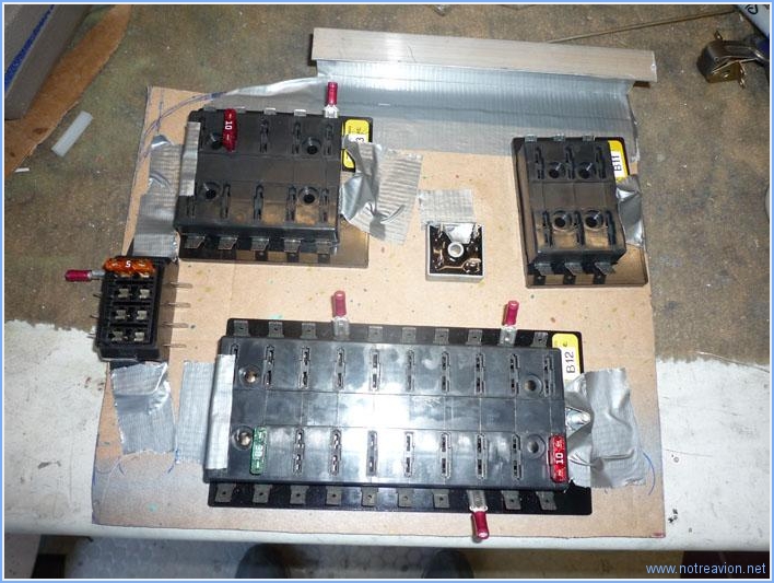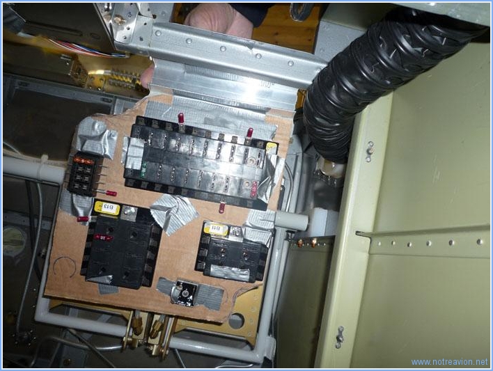 Assez peu d'avancement réel aujourd'hui, j'ai surtout découpé du carton pour faire des essais de montage des blocs de fusibles. Les fusibles ne seront pas accessibles en vol mais seront devront être faciles d'accès au sol. C'est pourquoi je vais les installer sur un support monté sur une charnière et situé sous le tableau de bord. Avant de commencer, j'installe tous les éléments qui risqueraient de créer des interférences avec le montage : la prise allume-cigare, la tirette d'arrivée d'air de secours, un interrupteur et la gaine d'aération visible sur la photo. Puis j'ai fait quelques essais, voici le premier avec les 4 blocs de fusibles et la diode. Le résultat n'est pas satisfaisant car le bloc inférieur est trop près du bord et donc du bandeau avec les interrupteurs. Voici le résultat final, le support est un peu plus large. La charnière est montée à l'arrière sur le bas d'un morceau d'aluminium en U. Sur le haut du U sera fixé une petite plaque permettant un retour vers le tableau de bord secondaire. Et voici une vue prise depuis la place de droite avec le support déployé devant les palonniers. Il ne reste plus qu'à fabriquer cela, il est peut être possible de diminuer les dimensions totales en rapprochant un peu les divers élements. Temps de travail sur le sous-ensemble Aujourd'hui : 4h (Total : 77h) |