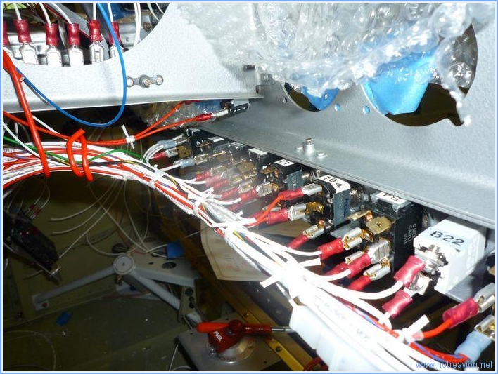 Suite de la mise au propre des câblage derrière le tableau de bord. Voici ce que cela donne derrière la rangée d'interrupteurs. J'installe la boite de commande du pilote automatique pour vérifier que cela ne gêne pas le passage des câbles. Pas de problème particulier de ce coté. Voici l'autre coté, la boite est derrière la nervure avec le domino et initialement je souhaitais fixer le harnais sur la partie inférieure de cette nervure. Mais cela risque d'entrainer un contact du harnais avec la boite de commande du pilote automatique. Il va falloir trouver une solution différente. J'ai également arrangé quelques autres câbles, dont ceux du boitier de commande de position des volets. Temps de travail sur le sous-ensemble Aujourd'hui : 3h (Total : 146h) |