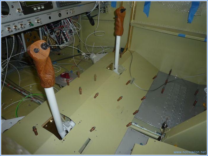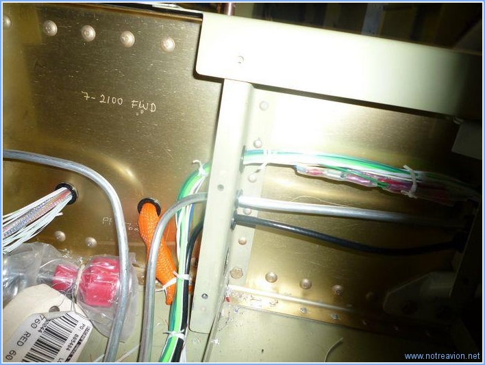 Comme il pleut à verse, le rivetage de l'aile est reporté à des jours meilleurs. Je continue la ligature des circuits électriques. Après avoir terminé le pied du manche droit et rajouté un câble manquant, je peux mettre en place provisoirement les planchers. Puis je fais quelques menus travaux annexes dont l'application du service bulletin sur la servo commande de profondeur du pilote automatique. Enfin je commence la ligature des câbles provenant de l'arrière du longeron principal et cheminant le long du plancher. Voici le début du coté gauche. Temps de travail sur le sous-ensemble Aujourd'hui : 4h (Total : 192h) |