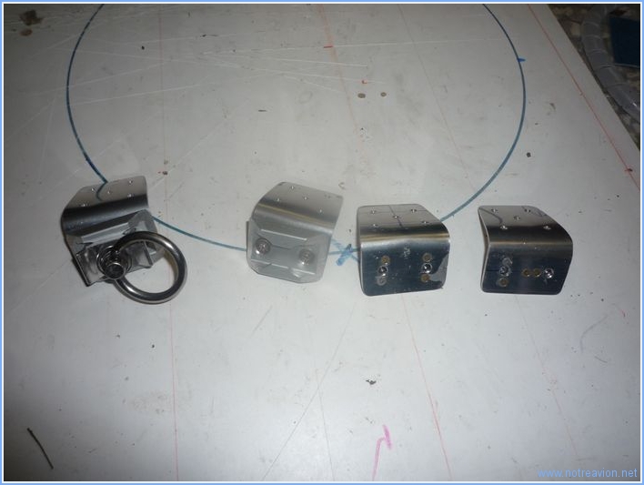 le moment de mettre en place les divers planchers approche avant d'installer ceux de la soute à bagages, je fabrique les système d'arrimage des bagages. Il s'agit d'installer quatre anneaux amovibles montés sur des petits supports. Les supports vont être fixés sur des équerres situées sous le plancher de la soute et rivetés sur les nervures. La fabrication des équerres est assez longue, il faut plier la tôle, faire les perçages, les ébavurages et poser les écrous prisonniers. Il me reste à faire les fixer sur les nervures. Temps de travail sur le sous-ensemble Aujourd'hui : 2h (Total : 242h) |