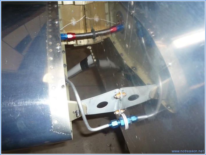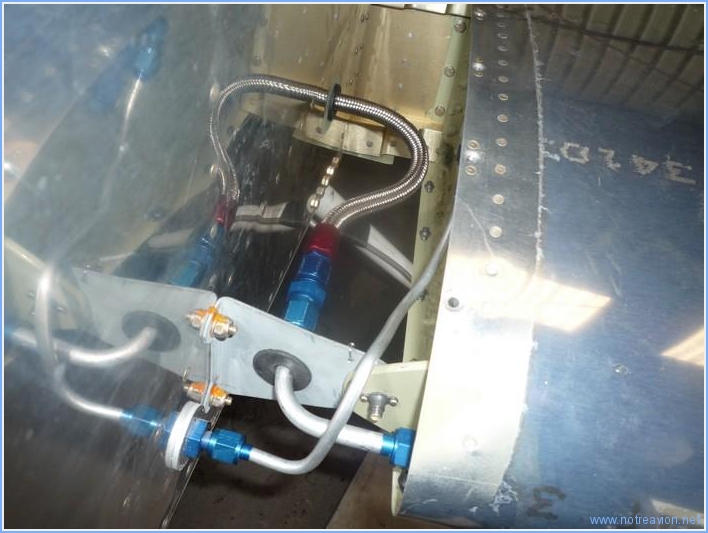 Before working on the fuel lines I connected the ruuder cables to the pedals. It looks easy, two bolts, two small steel strips, a few washers, a nut and a safety pin. But visibility is scarce and installing the safaty pins is a challenge. This is the fuel line on the left side. I first made the 90° angle out of tubing as going with the braided line was not possible due to a too small radius. I also connected the right fuel tank, this is mich easier as the connection is straight. Working time on this subpart Today : 4h (Total : 68h) |