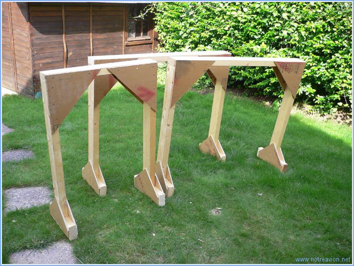 The fuse assembly is done on sturdy sawhorses and I find it will be useful to be able to cut of some height as the work progresses to be able to work at a correct height. So I fabricated three sawhorses, they are a bit too tall for the time being but it's easier to cut some height than to add it. Working time on this subpart Today : 2h (Total : 2h) |