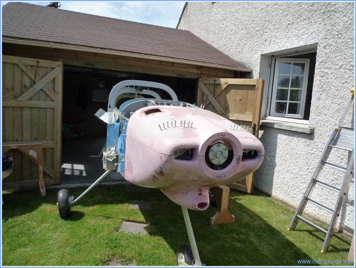 Après plus d'un mois d'arrêt, retour rapide dans l'atelier pour un grand rangement et faire prendre l'air au fuselage. En effet en préparation du montage du moteur, j'ai retourné le fuselage dans l'atelier pour être plus à l'aise pour travailler sur le moteur avant montage. Voici la sortie, il reste un cm de chaque coté, avec le moteur il faudra passer latéralement. Et voici le fuselage à l'air libre avant le demi-tour. Temps de travail sur le sous-ensemble Aujourd'hui : 1h (Total : 1h) |