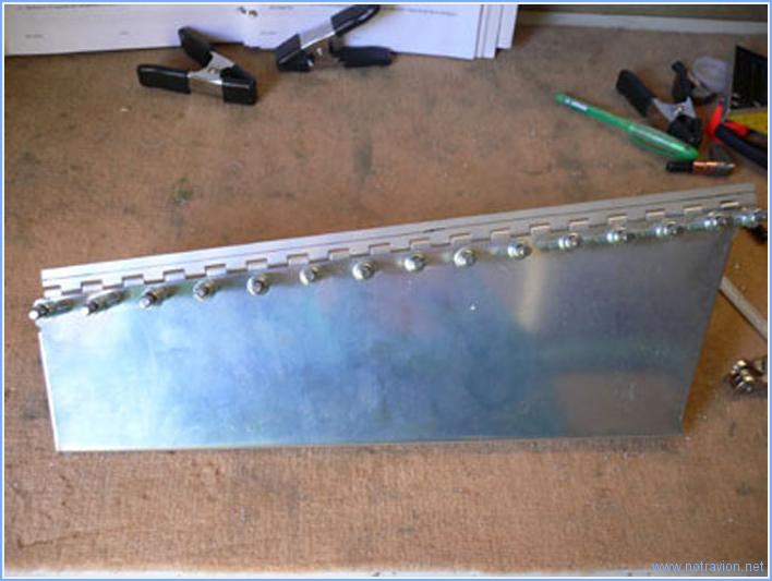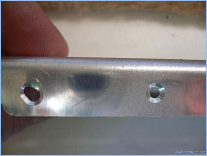 Tout d'abord les bonnes nouvelles, mon trim de profondeur ne pose pas de problème à Van's, un peu de ponçage est c'est bon. Ensuite réparation du contrepoids raté hier. Après avoir fait fondre un peu de plomb et rempli les trous on n'y voit plus rien. C'est ensuite que ça se gate, il n'a pas été possible de refaire le perçage exactement comme prévu, et les trous sur en sortie sont maintenant élargis. La solution initiale a été de refabriquer les bordures mal percées. Ensuite deuxième souci: j'ai des difficultés à produire des fraisages corrects avec la cage à fraiser achetée chez Avery. C'est plus un manque de technique qu'un problème d'outil. Sur la photo qui suit on voit bien que l'outil s'est "promené" pour ovaliser le trou. Comme la matière est assez fine j'avis bien ajouté une pièce à l'arrière mais sans doute n'était elle pas fixée assez fermement. J'ai décidé de changer la pièce ratée, c'est le longeron secondaire sur lequel vient se fixer le trim. Et donc j'ai également commandé les deux pièces manquées ce matin ainsi que d'autres broutilles. Pour finir j'a continué à monter le trim de profondeur, en fixant la charnière et en perçant tous les trous. En attendant les pièces commandées il y a largement de quoi faire, cela tient en une phrase dans les plans: ébavurer, embréver et passer le primaire, des heures en perspective. Temps de travail sur le sous-ensemble Aujourd'hui : 5h (Total : 25h) |