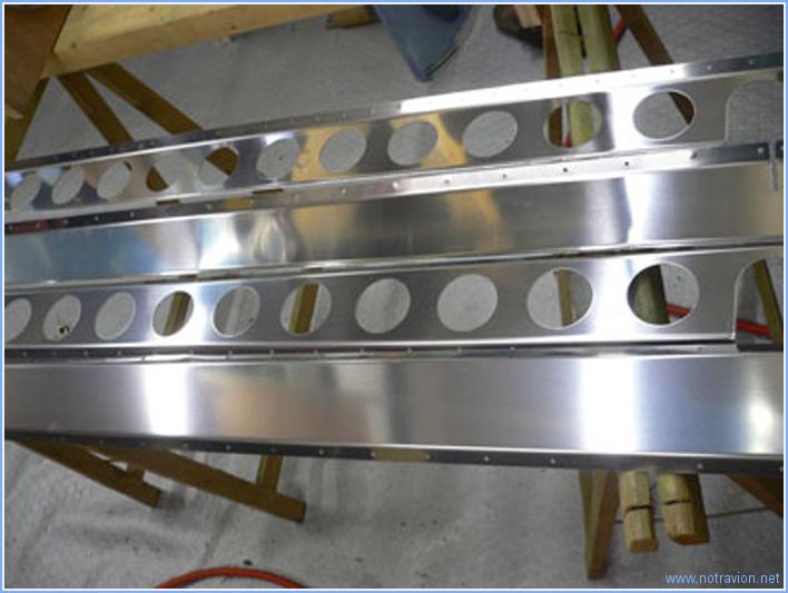 After some frightening moments yesterday, due to a miscalibrated levelling tool, I verified that my sekeletons are square and straight so as to be able to rivet the leading edges and the skins, and bolt on the fuel tanks. Working time on this subpart Today : 1h (Total : 29h) |
