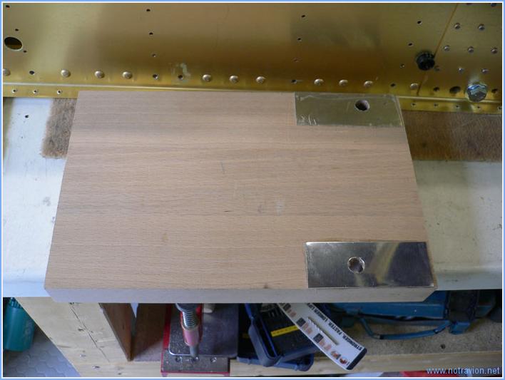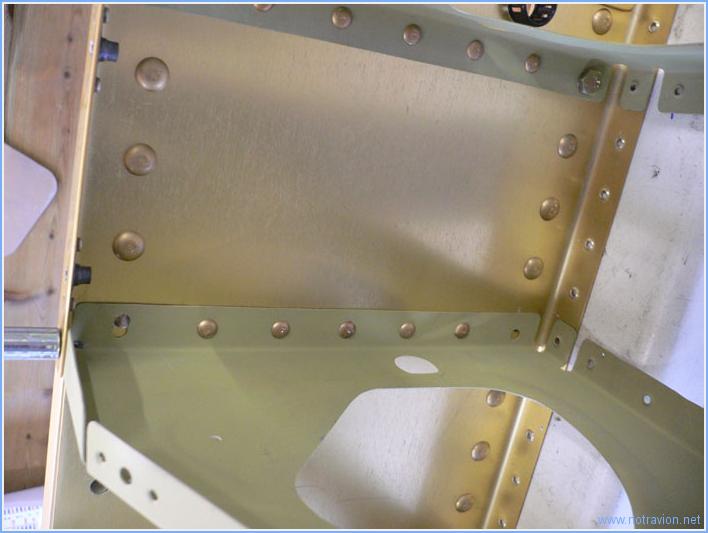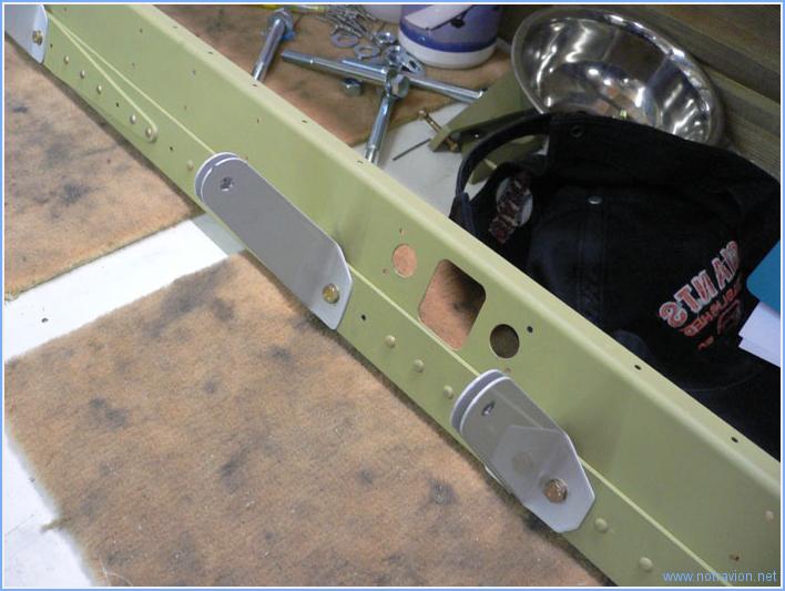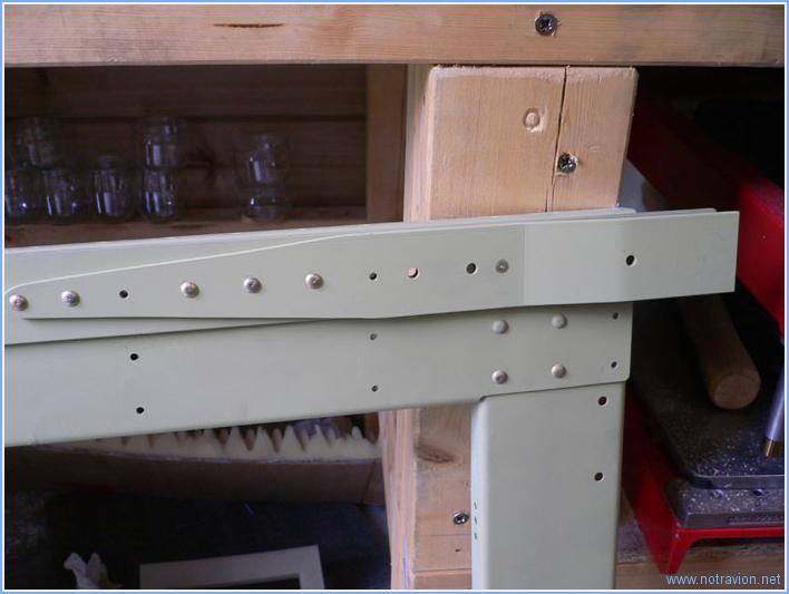 Aujourd'hui débute l'assemblage de la partie centrale du fuselage. D'abord je dois reriveter la fourche que j'avais été obligé de refaire. Ensuite je prépare des cales qui vont servir à simuler le longeron principal de l'aile dans la cadre principal. Ces cales ont été fabriquées par une amie ébéniste, mais l'accumulation de plusieurs contretemps a fait qu'elles sont un peu moins épaisses que prévues, pour compenser cela j'ai simplement collé des restes de tôles d'aluminium. Ensuite la partie sympathique commence avec le montage des nervures sur la partie arrière du cadre principal. Ces nervures sont fixées par un mélange de rivets et de boulons. J'ai également riveté les supports de la ceinture ventrale. Naturellement tout cela avançait trop bien. Une petite erreur faite en tout début de préassemblage mais que je pensais corrigée me cause quelques soucis. J'avais en effet mal positionné deux des nervures, m'en était bien rendu compte mais j'avais oublié que certains perçages étaient déjà faits. Une fois le repositionnement fait, les perçages sont décalés entre la nervure et le cadre. On devine sur la photo, à droite, le perçage à moitié recouvert et à gauche le perçage réouvert mais qui à la forme d'un huit sur la nervure. J'attends la réponse de Vans pour récuperer cela. Temps de travail sur le sous-ensemble Aujourd'hui : 3h (Total : 29h) |