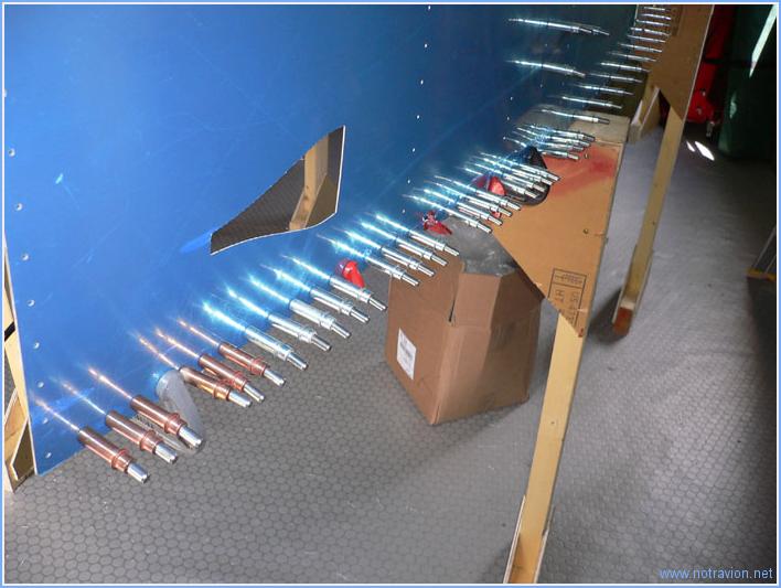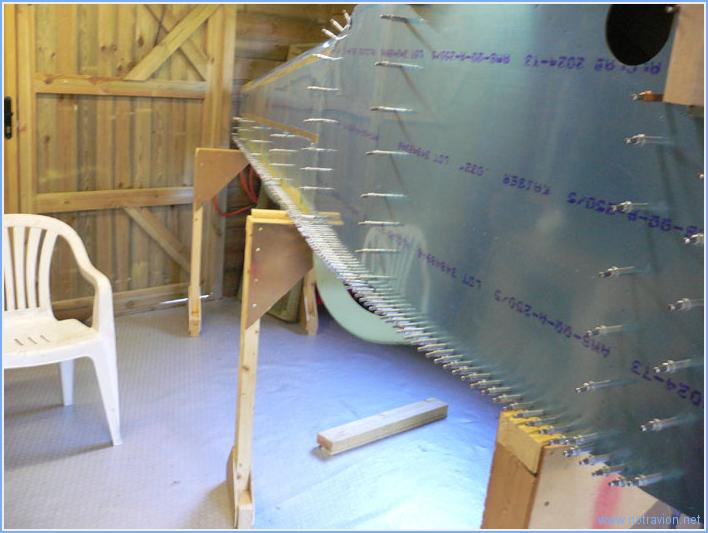J'ai démonté les deux longerons pour parfaire le pliage avant, ensuite le longeron gauche à été percé en position avec les peaux arrière et avant, 150 perçages et pinces à mettre en place. Il faudra naturellement fraiser tout ces trous avant assemblage. Temps de travail sur le sous-ensemble Aujourd'hui : 2h (Total : 12h) |