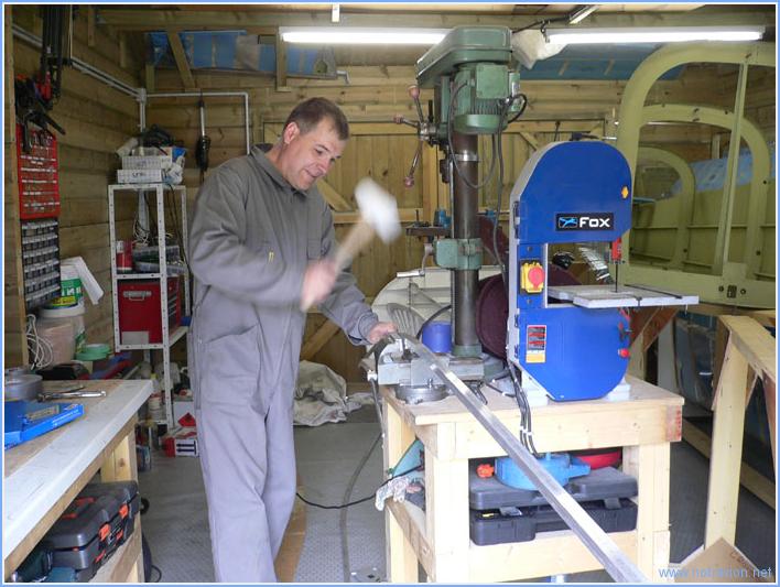 Today I did the bends in the longerons. first the shallow bend, on the picture there is still some bending to do to look like the remplate. A picture to show how it is done, the angle is put in in vise and then some pre-load is manually put on the angle, this preload is the applied permanently with the hammer. Progress has to be quite slow (an inch at at time). Then the two pieces are match drilled to the upper side, the forward bent and twist is made. Some parts have to be trimmed away at the aft end. I then use my botched rear fuselage to check all the parts, looks good so far. Working time on this subpart Today : 5h (Total : 7h) |