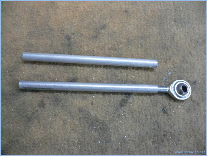 La suite des opérations consiste à percer les supports des jambes de train. Afin d'éviter que les jambes ne restent bloquées dans les supports, une bonne séance de ponçage s'impose avant la mise en place. Voici le résultat après perçage, avec le boulon en place. Puis je fabrique les bielles de commande de la profondeur, il y en a deux : une qui relie le manche au guignol installé dans le fuselage et une autre plus grosse depuis le guignol vers la gouverne. Pour percer les embouts, j'utilise le truc habituel en reportant les perçages de façon équidistante sur un morceau d'adhésif. Voici les deux bielles prêtes pour la peinture. Temps de travail sur le sous-ensemble Aujourd'hui : 3h (Total : 45h) |