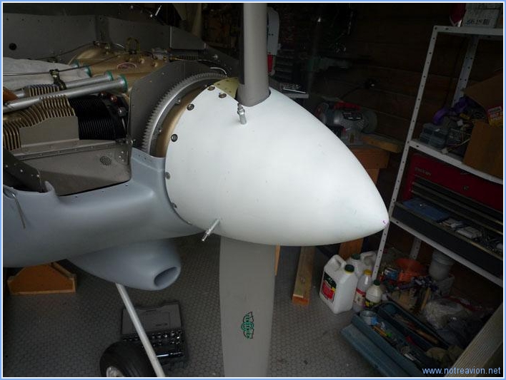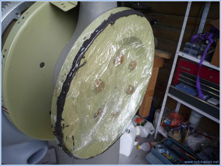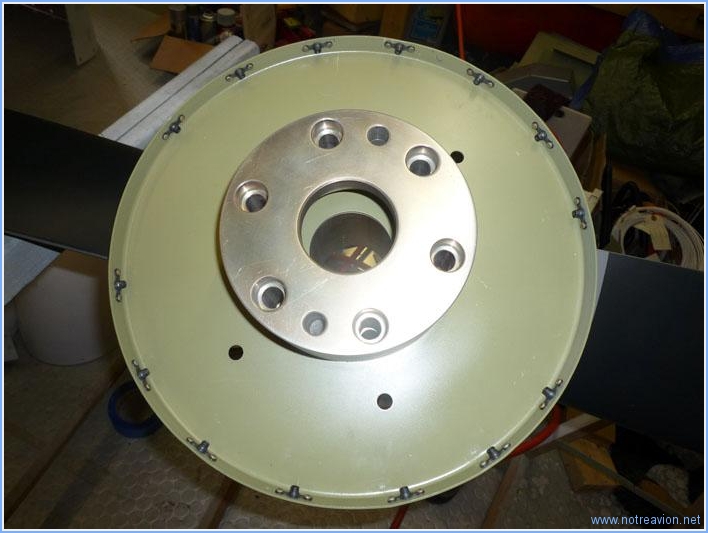 Suite de l'installation du cône de l'hélice. Après le passage d'une couche de primaire sur les petits inserts, ils sont assemblés et rivetés sur la plaque arrière. La photo montre un rivet manquant, qu'il n'a pas été possible de poser, ce sera fait après démontage de l'hélice. Puis, j'ai fraisé les perçages du cône et fignolé les passages des pales. La plaque avant présente des petits jeux avec le cône. Pour les rattraper je fabrique un simili joint en mastic pour réservoir. Le séchage devant se faire en positon, la plaque est enveloppée de cellophane ce qui évite au mastic d'y adhérer. Voici une vue de la vis qui maintient le cône sur le petit insert. Et voici une vue d'ensemble du cône monté. Il ne reste qu'à attendre le séchage du mastic. Temps de travail sur le sous-ensemble Aujourd'hui : 2h (Total : 11h) |