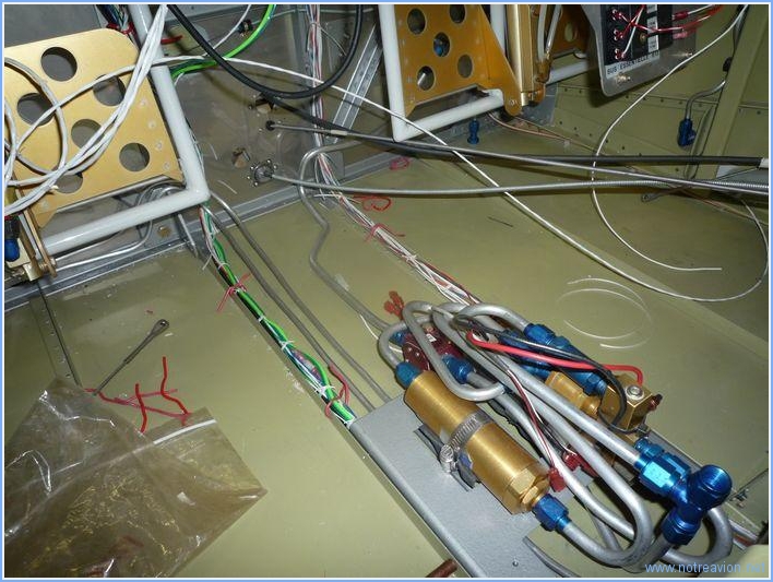 Le but était de mettre au propre les pieds de manche, pour cela il fallait commencer par terminer de faire passer tous les fils et tuyaux par le cadre principal. Il y a notamment les tuyaux de pression de l'indicateur d'incidence. Il a fallu percer un passage supplémentaire pour le passage. Ce perçage, bien que non prévu par Vans, est fait par de nombreux constructeurs en des endroits divers sur le cadre. J'ai choisi la deuxième baie, assez loin de tout autre perçage et structure. Il y a également deux câbles à installer qui relient la prise du micro à l'alternat du manche. J'ai donc installé provisoirement les prises micro et écouteurs. Et voici tous les câbles en place et sécurisés sur le domino. Temps de travail sur le sous-ensemble Aujourd'hui : 2h (Total : 188h) |