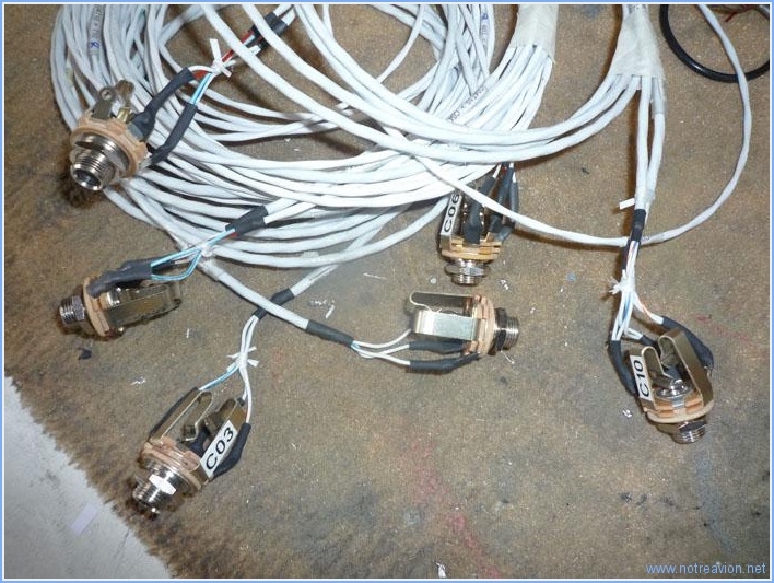Avant de commencer les soudures sur les prises micro et casque, je termine le harnais du transpondeur. Il y a quelques câbles à marquer et la prise de l'alticodeur à installer. Encore un quinzaine de câbles terminés. Ensuite je soude les câbles sur les prises micro et casque. Il faut faire attention aux cosses utilisées, aux nombre de câbles à installer sur la cosse ainsi qu'à l'installation de la gaine thermorétractable qui ne se fait pas toujours sans mal (elle rétrécit avec la chaleur de la soudure si on oublie de l'éloigner du point de soudure). Voici tous les câbles avec toutes les prises. Temps de travail sur le sous-ensemble Aujourd'hui : 4h (Total : 114h) |
