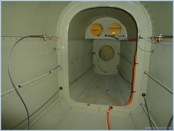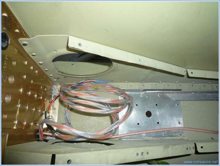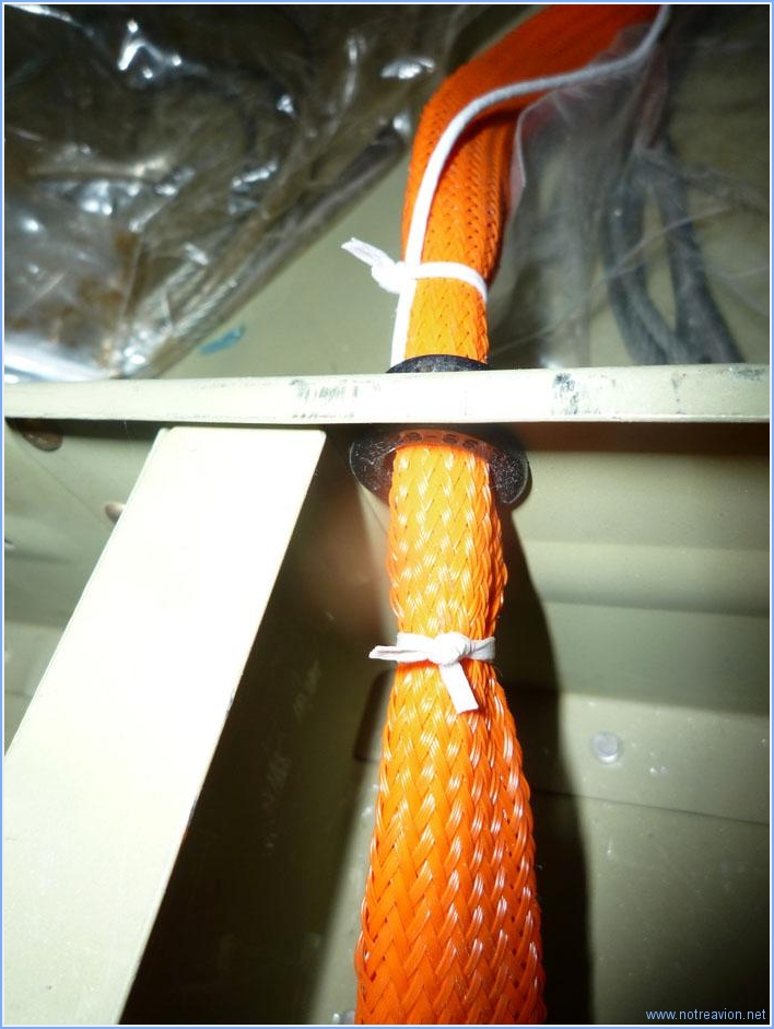 Les seuls câbles restant à poser en provenance de l'arrière du fuselage sont ceux des strobes. J'ai fais passer les deux câbles dans le tunnel central, puis chacun va rejoindre son coté par des orifices situés sous les sièges qui permettent également le passage d'autres câbles : liaison entre les deux dominos au pied des manches, phares et feux de navigation. Il ne reste plus de câble à passer sous la soute à bagage, il reste six câbles à passer depuis le cadre situé à l'arrière des sièges et un quinzaine de câbles à passer par le cadre principal. Temps de travail sur le sous-ensemble Aujourd'hui : 2h (Total : 69h) |