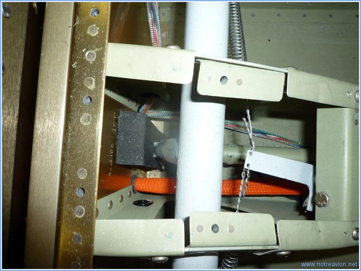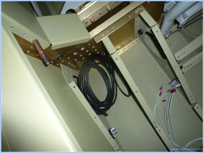 Suite du câblage, avec l'installation des câbles passant sous les sièges. Je commence par les câbles des feux de navigation et des phares qui sont tous rassemblés sur un domino sous le siège gauche. Sur ce même coté gauche, je vérifie le passage au niveau du cadre principal, il y a là l'antenne NAV, les câbles des phares, la tuyauterie du tube pitot et il reste encore 8 petits câbles à passer pour les commandes au niveau du manche de gauche. Le tunnel central commence à être également bien encombré après le passage des câbles pour les volets : commande moteur et capteur de position. Il reste à passer au centre les câbles pour la servo-commande du trim d'aileron. Temps de travail sur le sous-ensemble Aujourd'hui : 4h (Total : 73h) |