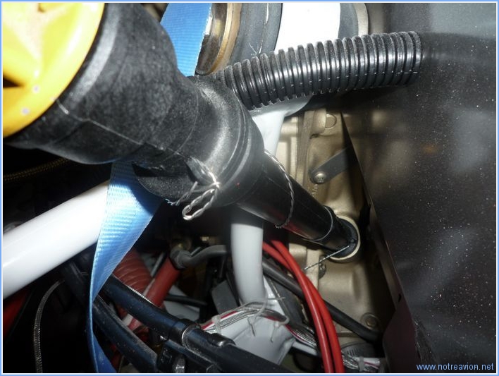 La commande de mixture ou richesse a été installée, voici le montage sur le bloc d'injection. J'ai rajouté une rondelle pour que le jeu entre la rotule et le bras de commande soit un peu plus grand. Il me reste à vérifier si le boulon est monté dans le bon sens, il me semble avoir vu une discussion à ce sujet sur Vansairforce. Et voici le passage à travers la cloison pare-feu. j'ai eu un petit souci car j'avais percé la rotule au diamètre de la commande fournie par Vans, hors la nouvelle commande est un peu moins large car elle n'est pas entourée par une gaine de protection. Pour le moment j'ai juste installé un morceau d'adhésif mais il faudra arranger cela lors des réglages définitifs. J'ai également mis en place les tubes de ventilation. Voici celui pour la pompe carburant qui est fixé sur le carénage de la pompe avec une goupille fendue. Voici le coté moteur avec une goupille fendue installée à droite. Le tube coté gauche va ventiler la magnéto gauche, il sera fixé un peu plus tard avec une goupille, si j'en trouve, sinon avec du mastic. Temps de travail sur le sous-ensemble Aujourd'hui : 2h (Total : 166h) |