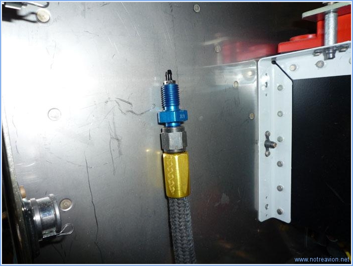 Comme je suppose que l'espace entre l'arrière du moteur et la cloison pare-feu sera assez chaud suite à l'installation des deux silencieux, je préfère protéger un peu mieux la pompe mécanique carburant et éviter ainsi tout risque de cavitation (vapor-lock). Le sites internet consultés considèrent cette opération assez délicate car l'accès à la pompe et à ses boulons de fixation n'est pas aisée. à?tant prévenu, l'opération s'avère faisable. La photo montre le carénage noir en place. Il faudra que je rédémonte le tout car il faut remplacer le joint entre la pompe et le bloc moteur. J'ai pris récemment livraison de tous les capteurs moteurs. Il faut donc commencer à les installer. Cela commence par la sonde de température d'huile qui vient se visser sous le filtre à huile, c'est le boulon du haut avec le cablâge Puis, c'est au tour des sondes de température des têtes de cylindre. Un support est à visser dans le cylindre, sous la bougie inférieure et la sonde vient ensuite se fixer par quart de tour sur le support. La photo montre les quatre sondes ainsi que les quatre supports. Voici une des sondes installée. Ensuite, un peu plus délicat à installer, les sondes de température des gaz d'échappement. Elles sont à positionner sur les pipes d'échappement entre 5 et 20 cm du cylindre sur une portion rectiligne. Et cette distance doit être la même pour les quatre cylindres. Voici l'installation sur les cylindres 1 et 3, du coté droit de l'avion. Les sondes sont à 6 cm du cylindre, sur le cylindre 1 c'est dans une portion courbe mais il n'a pas été possible de faire autrement. Si on met les sondes plus loin du cylindre, il faute descendre sous le raccord qui est sur le cylindre à gauche sous la sonde. Mais dans ce cas on est en plein sur le raccord d'un des cylindres de l'autre coté. Il faut aussi positionner les sondes de telle manière que les bougies restent accessibles pour la maintenance. De l'autre coté, il n'y a aucun problème avec la distance choisie. Ensuite j'installe le raccord et la tuyauterie de prise de pression d'admission. Il faudra que je modifie le raccord pour en restreindre le diamètre pour éviter des fluctuations importantes de la valeur mesurée. Voici l'autre extrémité du tuyau précédent. Il faudra faire également des modifications car j'ai besoin de deux sorties : une pour les instruments de bord et l'autre pour l'allumage électronique. Temps de travail sur le sous-ensemble Aujourd'hui : 4h (Total : 131h) |