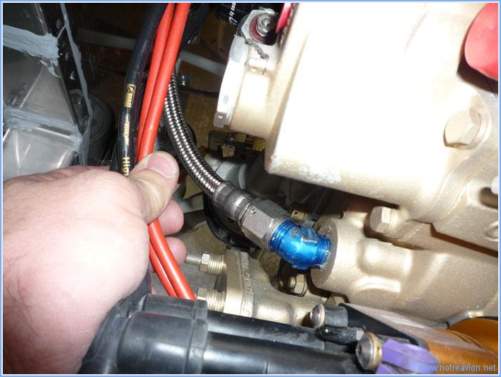 Le matériel fourni par Vans dans le kit d'équipement moteur pour l'installation du reniflard n'est pas utilisable dans ma configuration. Le montage du filtre à huile empêche l'installation de la durite coudée. Sur cette durite devrait venir se brancher une tuyauterie coudée en aluminium dont la sortie est dirigée vers la sortie inférieure du capot, soit directement ce qui risque de salir le ventre de l'avion, soit sur une des pipes d'échappement, ce qui n'a pas la faveur de certains inspecteurs du GSAC. J'ai donc fait le montage un peu différemment, en utilisant une durite souple sur toute la longueur. Voici le branchement sur le reniflard derrière le filtre à huile. Et voici la sortie, sur un bol acheté chez Aircraft Spruce car cela fait aéronautique, mais n'importe quel récipient un tant soi peu résistant ferait l'affaire. J'ai également refabriqué toutes les tringles de maintien inférieures des cloisons. Temps de travail sur le sous-ensemble Aujourd'hui : 2h (Total : 126h) |