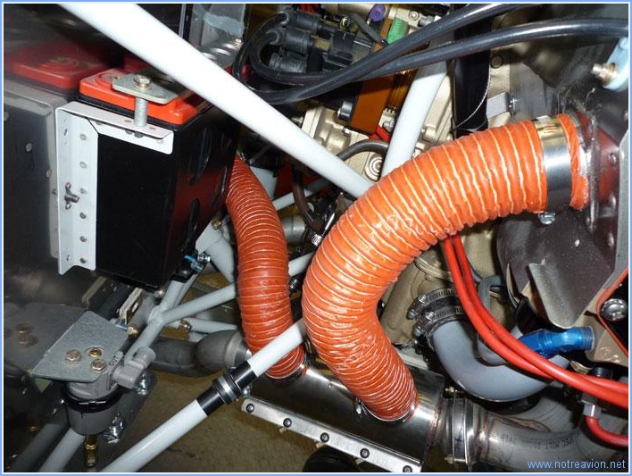 J'ai quand même décidé d'installer les gaines du coté gauche. Mais auparavant j'ai fabriqué quelques petites pièces nécessaires au maintien des gaines. La gaine est cerclée par une bande en acier inoxydable qui est boulonnée sur une bride fixée sur le bâti moteur. Il faut aussi fabriquer de petites équerres car les fixations ne sont pas dans le même plan. Voici une photo pour montrer cela. Voici le cheminement depuis la rampe avant. Il reste à fabriquer ou acheter les supports, mais il faut d'abord que je réinstalle le capot pour vérifier s'il n'y a pas d'interférences. Voici la sortie du coté gauche, l'air est simplement évacué vers la sortie du capot. Si nécessaire il sera toujours possible d'installer une ouverture dans la cloison pare-feu pour avoir une peu plus de chauffage. Temps de travail sur le sous-ensemble Aujourd'hui : 2h (Total : 121h) |