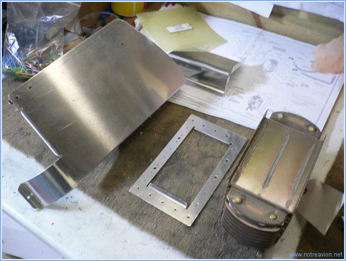 Suite de l'installation du radiateur d'huile. Le bord du coté droit doit être modifié pour être à  plus de 13mm du bati moteur, sinon il risque de le toucher. Le haut et le bas de ce bord droit sont donc découpés en conséquence.