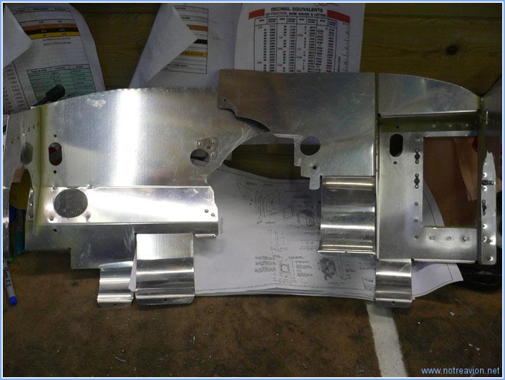 Voici le résultat après découpage, ponçage, ébavurage et embrévage. Le renfort en angle est de l'autre coté de la cloison. J'ai également installé le passe-fil pour les câbles des bougies suppérieures.