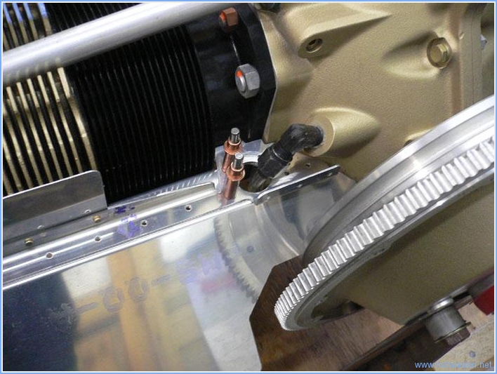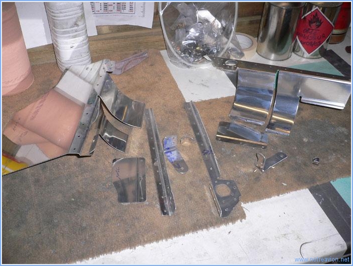 Suite du travail sur les parties de cloison de la chicane. Cela commence par le rivetage des pièces préparées hier. Voici une des pièces avec trois renforts en place après ébavurage, embrévage, une petite couche de primaire entre les pièces et enfin rivetage. Ensuite j'ébavure toutes les petites pièces qui sont livrées assez grossière suite au procédé de fabrication. Puis commence la travail sur les parties avant, avec le début du montage de la cloison du coté avant droit. Il y a au total cinq parties à assembler. Un Å?illet en caoutchouc est installé pour permettre le passage de la conduite d'huile de régulation de l'hélice. Le moteur en est équipé bien que j'installe une hélice à pas fixe. Temps de travail sur le sous-ensemble Aujourd'hui : 3h (Total : 25h) |
