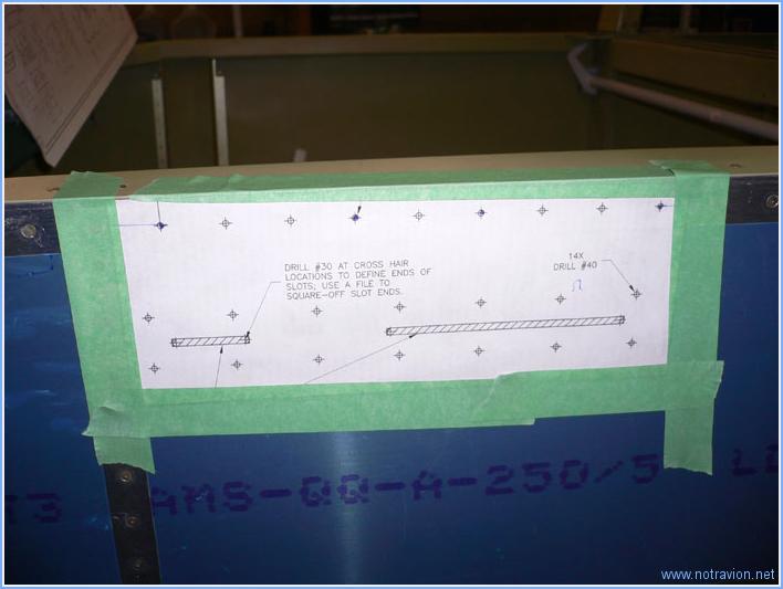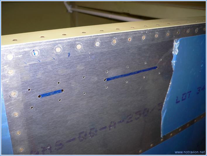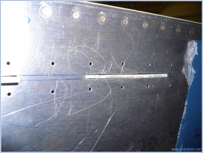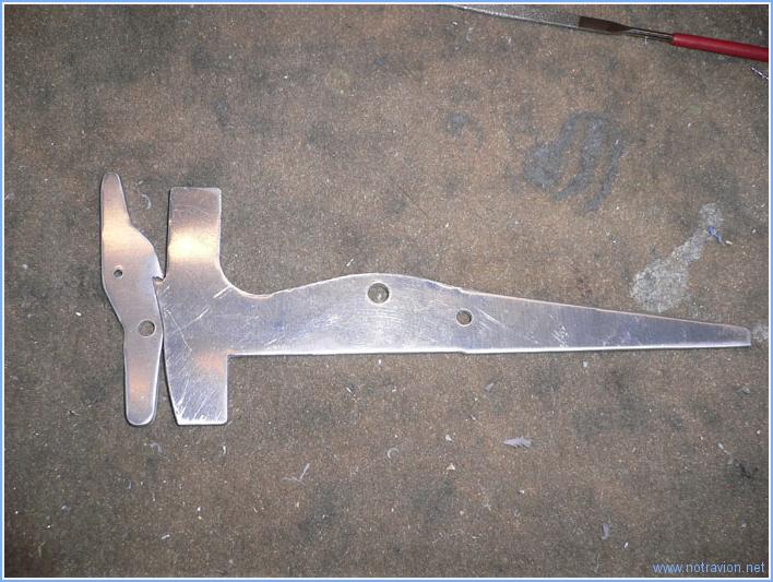 La verrière se verrouille à l'arrière par deux verrous inférieurs, un verrous supérieur et sur le coté gauche par un verrou latéral. Je commence l'installation des verrous inférieurs arrières, rien de bien compliqué. La photo montre le verrou arrière gauche en position fermée. Voici le même verrou en position ouverte. La commande se fait par une bielle qui viendra se fixer sur la pièce en aluminium brut et sera commandée par le verrou latéral. Voici les deux pièces du verrou latéral. Le procédé de fabrication laisse beaucoup de bavure, il faut donc les poncer correctement Pour installer le verrou latéral, il faut faire deux encoches sur le coté gauche du fuselage, un travail à haut risque si on se rate. Voici le gabarit collé à l'endroit des perçages. Ensuite, les encoches sont dessinées sur le fuselage. je les fait manuellement à la lime, l'utilisation d'un outil électrique ou pneumatique me paraissant présenter trop de risque de dérapage. Les deux encoches sont terminées, sur celle de l'arrière, j'ai glissé le verrou. La photo donne l'impression de vagues dans la découpe, mais en réel c'est imperceptible. Temps de travail sur le sous-ensemble Aujourd'hui : 3h (Total : 14h) |