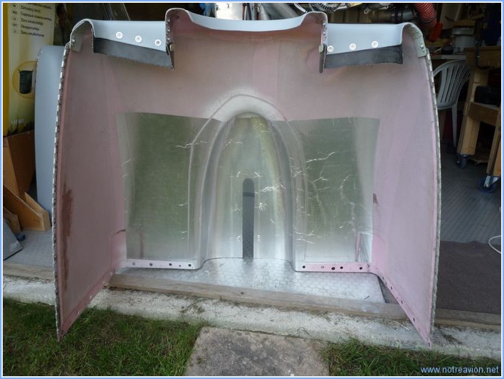D'après mes prédécesseurs, les capots souffrent un peu de la chaleur autour du pot d'échappement. Pour tenter de les protéger je recouvre le capot inférieur d'une feuille d'aluminium adhésive. Etant donnée la forme complexe, ce n'est pas vraiment facile.I cover the lower cowl with an adhesive heatshield as the heat of the exhaust can melt this part. The complex curves make the task quite difficult. Temps de travail sur le sous-ensemble Aujourd'hui : 1h (Total : 154h) |