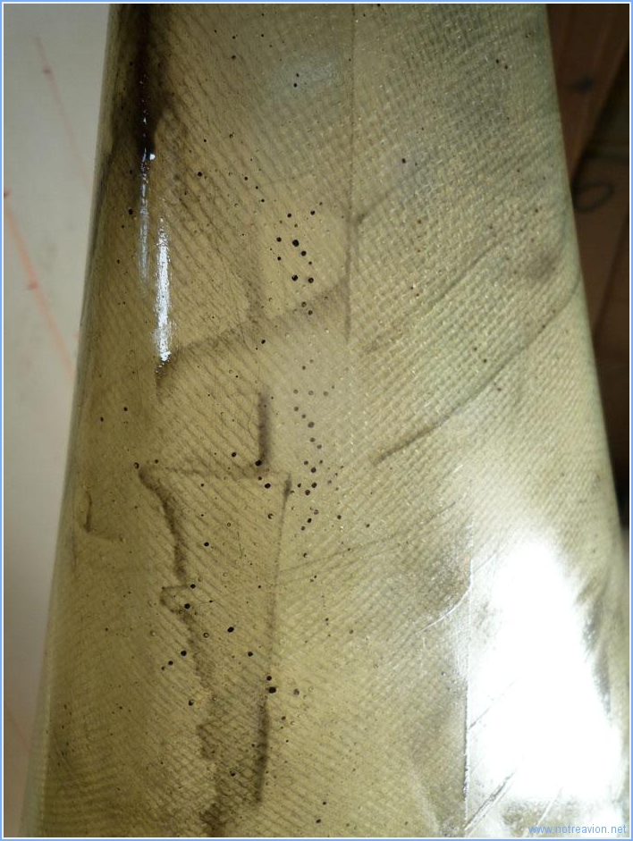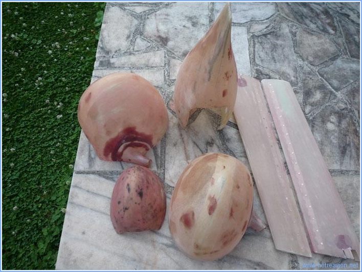 Les pièces mastiquées hier ont été poncées et les petits défauts découverts mastiqués. La couleur rose est due au colorant rouge mélangé à la résine pour en accroitre la visibilité. En fin de journée, le total des heures comptabilisées pour la construction atteint 1500h, 3 ans et 4 mois après le début. Temps de travail sur le sous-ensemble Aujourd'hui : 2h (Total : 70h) |