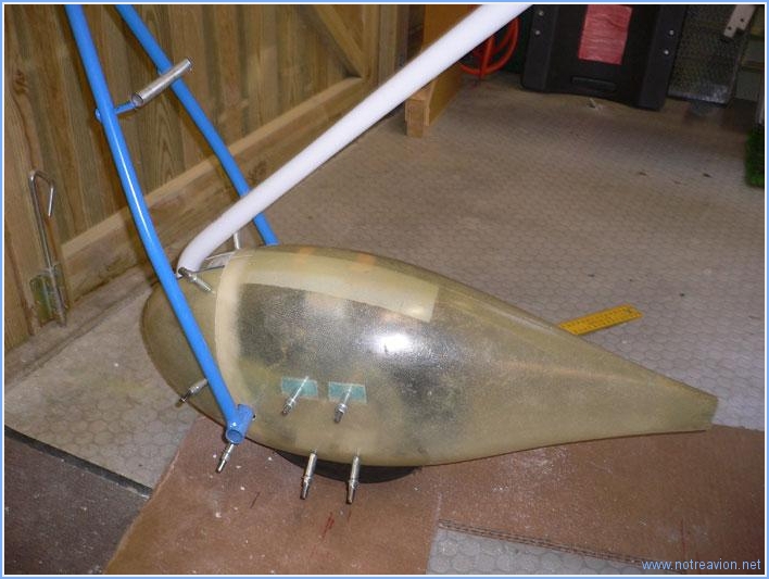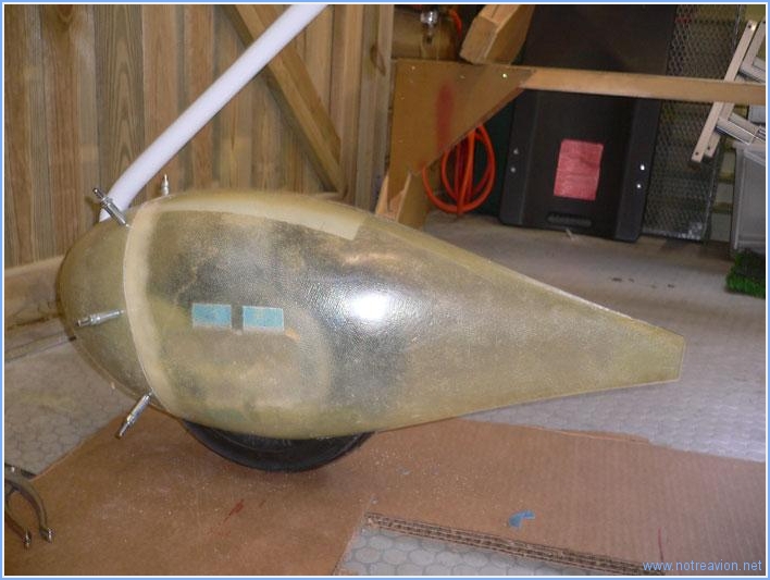 Il me semble plus simple de faire l'ajustement des carénages du train avant de monter le moteur. L'alignement des carénages doit se faire avec le fuselage en ligne de vol et les roues ne touchant pas le sol. Ce sera plus simple à mettre en oeuvre sans le poids du moteur. Je commence par fabriquer deux petits supports mobiles qui permettront le moment venu de déplacer le fuselage latéralement dans l'atelier. Puis j'assemble les deux moitiés du carénage de la roue avant, avec un peu de ponçage l'ajustement ne posera pas de difficulté. J'assemble également les carénages des trains principaux. Globalement l'ajustement est correct. Voici une photo de la jonction entre les deux demi-coques, par endroit il y a un petit écart de 1mm. Puis j'ai vérifié l'alignement des carénages des jambes de train, le petit montage avec deux équerres sert à vérifier qu'il n'y a pas de torsion le long de la pièce. Sur le plan se trouve un gabarit qui va servir à découper le carénage. Temps de travail sur le sous-ensemble Aujourd'hui : 2h (Total : 18h) |