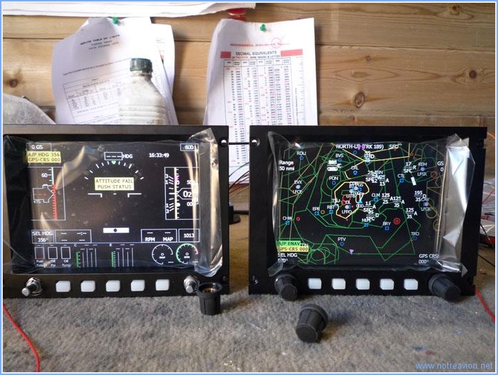 The panel will incorporate two GRT Sport EFISes from GRT Avionics. After having had a look at all the part I fired the screens up on by bench. The first two pictures are the booting screens, just for software documentation purposes. And thes are both screens interconnected. The informations are still incomplete as the magnetometers are not connected. The colors are missing too. The left screen shows attitude, roll, speed, heading.. and engine informations on the lower strip. The right screen shows the map with airports and airspace. Working time on this subpart Today : 1h (Total : 3h) |