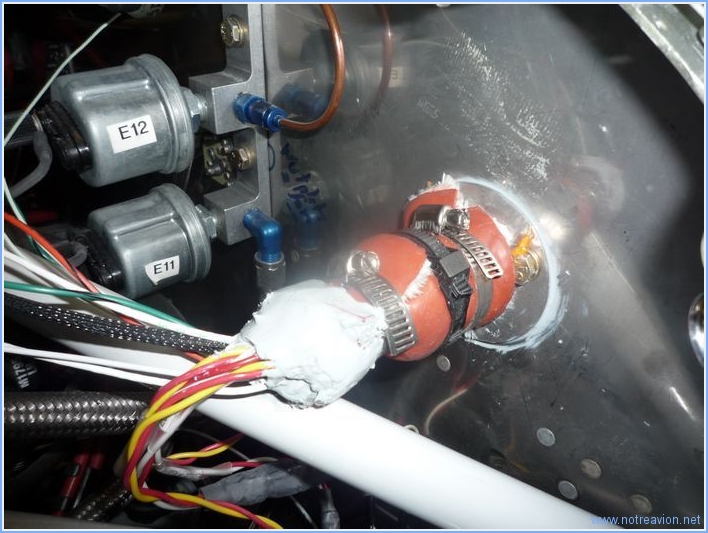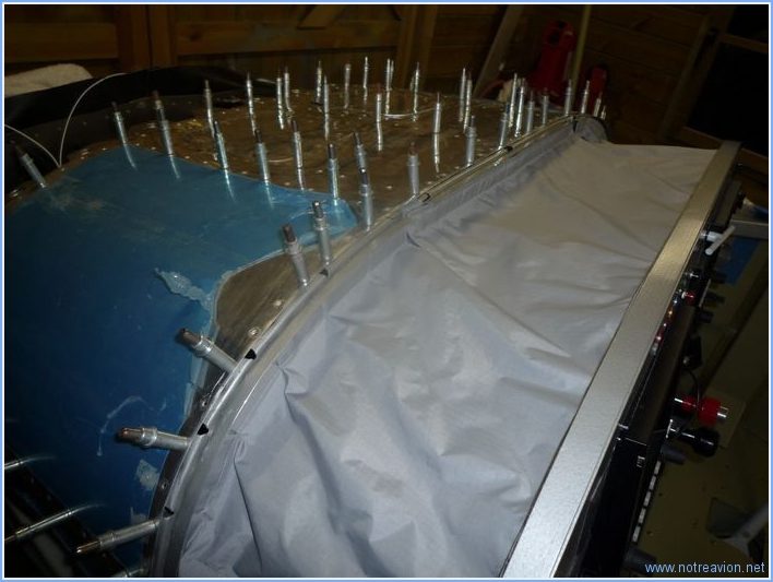 J'ai tout d'abord installé des brides plus adaptées sur les passe-fil de la cloison pare-feu. Voici le coté gauche. Ensuite j'ai installé la protection de l'arrière du tableau de bord. Il s'agit d'une bande de toile cirée fixée avec des velcros, qui devrait éviter que de l'eau ne s'infiltre ce qui est assez courant avec la verrière basculante, notamment lors de l'ouverture en cas de pluie. J'ai également installé la dernière peau qui reste à riveter, mais je vais attendre un peu avant de la faire pour être sà»r que tout est bien terminé à ce niveau. Temps de travail sur le sous-ensemble Aujourd'hui : 2h (Total : 244h) |