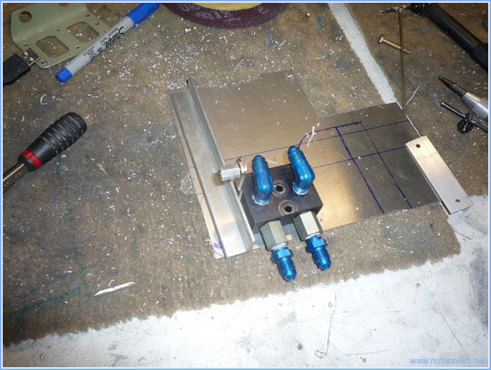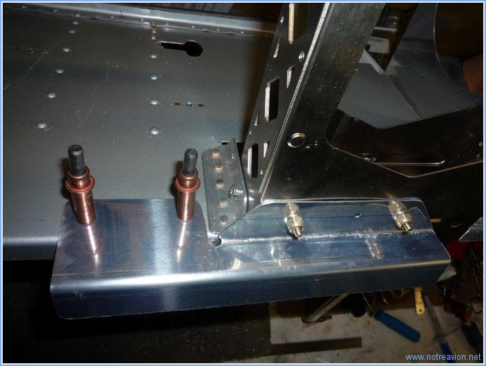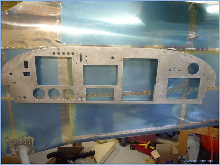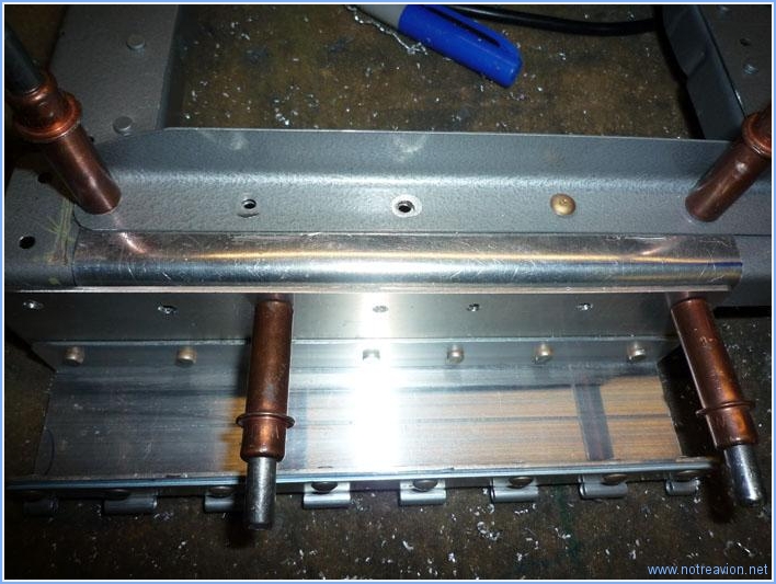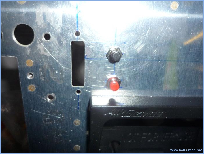 Après le démontage d'hier, il s'agit maintenant d'installer tous les éléments de fixations : cornières, écrous prisonniers.. Je commence par la fixation du support des blocs de fusibles. Avant de poser les rivets je fabrique une cornière de renfort car l'arrière du tableau de bord me semblait un trop flexible. Pour le montage il a fallu "dériveter" une cornière déjà posée lors du montage de la boite à gant. Voici une vue montrant une partie des écrous prisonniers ainsi que les cornières (à droite) pour le calculateur d'incidence. Une fois tous les supports installés, j'ai continué sur le tableau de bord en faisant les perçages pour les boutons poussoirs du calculateur d'incidence. Temps de travail sur le sous-ensemble Aujourd'hui : 4h (Total : 89h) |