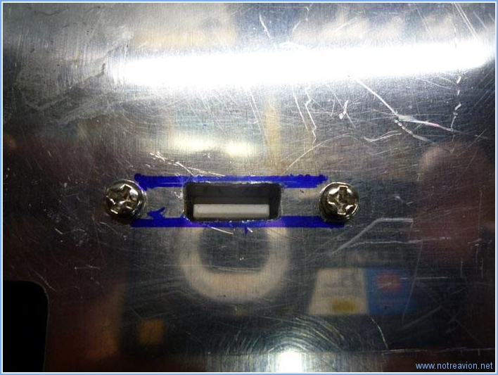Les EFIS disposent d'une prise USB permettant la mise à jour des logiciels et l'enregistrement des paramètres en vol. La prise est sur la face arrière de l'EFIS mais une rallonge permet l'installation en façade sur la tableau de bord. Avant de faire les perçages sur le tableau je fait un essai sur une chute. Voici l'emplacement prévu pour la prise de l'EFIS gauche. Et voici l'emplacement prévu à droite. J'ai également installé un des dominos, voici celui prévu pour les certains capteurs de l'EIS. Temps de travail sur le sous-ensemble Aujourd'hui : 1h (Total : 83h) |