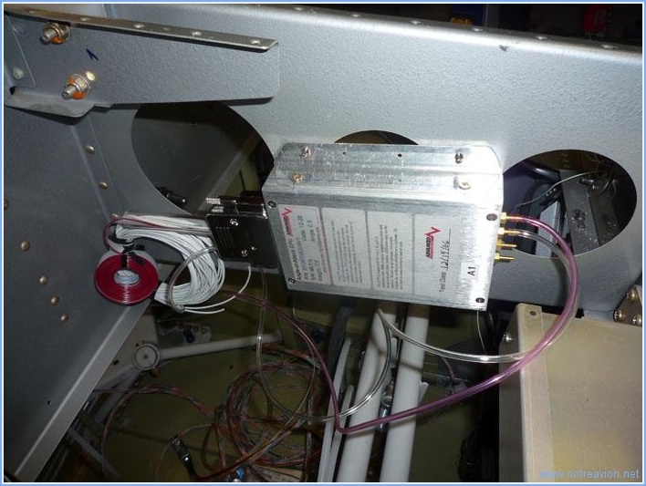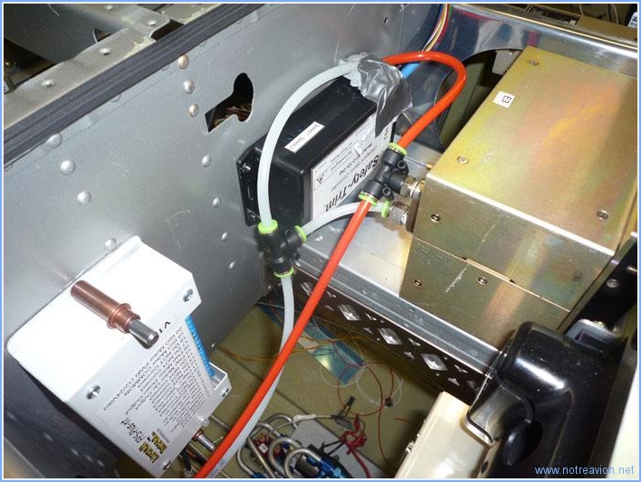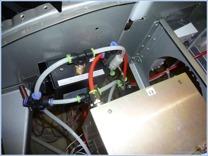 La journée a été consacrée au positionnement d'une partie des éléments derrière le tableau de bord et à la fabrication des circuits de pression statique et totale. La photo montre l'arrière de l'EFIS du coté gauche avec la mise en place de l'alticodeur. On voit également le deux circuits de pression, le circuit rouge pour la pression totale (EFIS, indicateur de vitesse, mesure d'incidence, pilote automatique de ce coté) et le circuit blanc (même instrument que le rouge avec en plus l'alticodeur et l'altimètre). J'avais dessiné de beaux circuits qui se sont révélés infaisables en réalité, je vais refaire le schéma en fonction de l'implantation réelle. Voici l'installation du calculateur d'incidence. Il est monté sur deux cornières sur la nervure entre la cloison pare-feu et le panneau arrière du tableau de bord. Normalement il n'y a pas besoin d'y vaoir accès de façon régulière. Les deux petits tuyaux sont de piquages de pression sur les circuit rouge et blanc vu ci-dessus. Et voici l'arrière du GPS et de l'EFIS de droite. A gauche, le calculateur de position des volets et à droite, le calculateur de trim avec le pressostat de changement de programme de vitesse de trim. Temps de travail sur le sous-ensemble Aujourd'hui : 5h (Total : 73h) |
