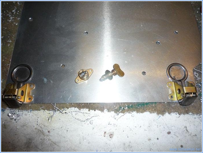 Aujourd'hui, il s'agissait de mettre en pratique les gabarits fabriqués hier. Voici le support après découpe et rivetage de la charnière à l'arrière. Voici la charnière à l'arrière ainsi que sa fixation sur la partie arrière du tableau de bord. Après pas mal de découpe, j'ai mis en place deux verrous pour maintenir le support en position fermée. Mais les verrous ne me plaisent pas vraiment, je vais installer des verrous avec un verrouillage plus efficace. C'est des verrous (exemple au centre de la photo) dont le principe est le même que pour les fixations du capot avec un verrouillage par quart de tour. Voici l'installation sous le tableau de bord avec les verrous fermés. Et voici une vue de dessous. Je vais sans doute remplacer les vis papillons par des vis simples pour éviter que le passager ne se blesse car elles dépassent un peu. Temps de travail sur le sous-ensemble Aujourd'hui : 5h (Total : 82h) |