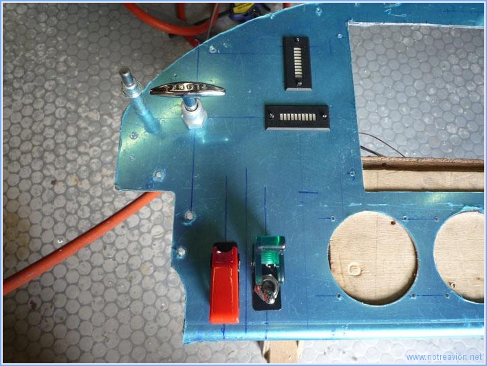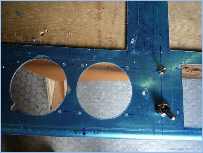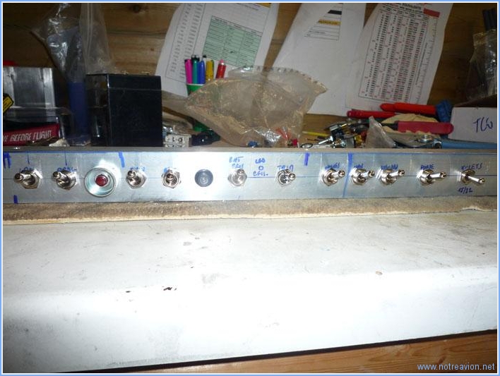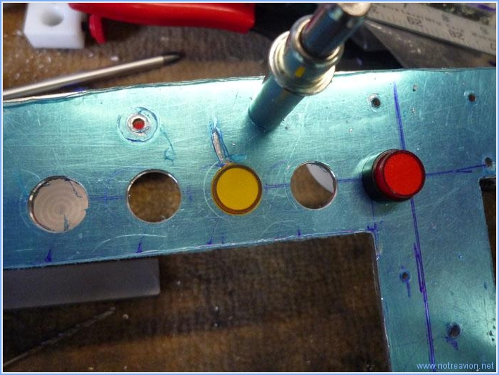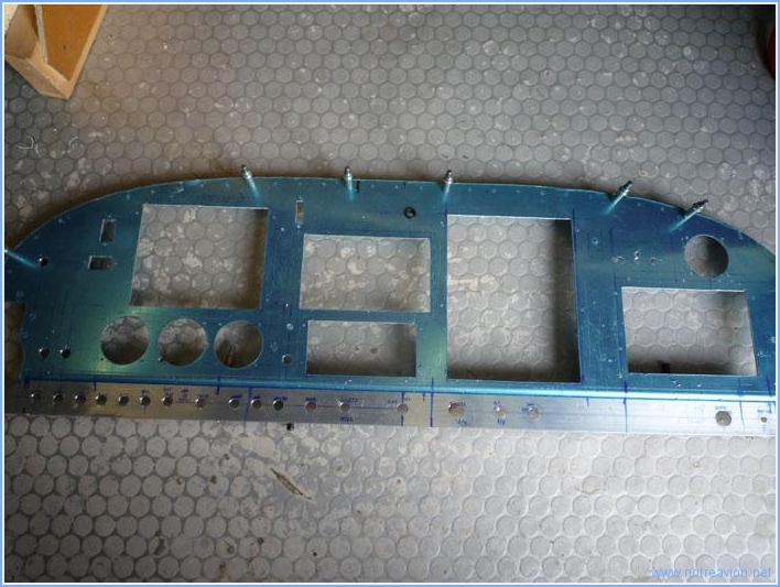 Avant de continuer à faire des trous dans le tableau de bord, je perce la panneau secondaire pour la fixation de la nervure de maintien gauche. Je marque également le panneau secondaire pour la découpe du passage de la radio et du transpondeur. Le bas de la réglette correspond au bas du tiroir du transpondeur. Il dépassera un peu sous le panneau. Puis je fais divers perçage sur le coté gauche du tableau de bord. Il y a les deux indicateurs de trim, le frein de parc et deux interrupteurs pour les magnétos. Je n'ai pas encore fais le choix pour les caches. Un peu plus au centre, un interrupteur pour le pilote automatique et un mini-interrupteur pour le choix de la source GPS alimentant le pilote automatique. On note également une petite découpe en bas à gauche de l'emplacement prévu pour l'altimètre, c'est le passage du bouton de réglage de la référence barométrique. Ensuite, perçage du support des interrupteurs et commandes moteur. Les perçages pour les vis de fixation du support sur le tableau sont également faits dans la foulée. Puis, les derniers gros perçages sur le tableau pour les voyants d'alarme. Normalement ils se montent comme le voyant rouge à droite mais je vais essayer de les installer comme le voyant jaune. Pour cela je fabrique un petit support et deux cales avec des chutes diverses. Et voilà le résultat. Il reste un peu d'ajustement à faire pour que cela soit parfait. Temps de travail sur le sous-ensemble Aujourd'hui : 6h (Total : 45h) |