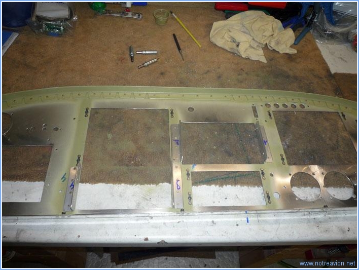 Je commence par faire les perçages des cornières de fixation des tiroirs des radio ainsi que du GPS. Beaucoup de montage et de démontage pour obtenir le résultat souhaité. Naturellement il se pose quelques petits problèmes une fois que ces cornières sont installées. On devine deux perçages proches l'un de l'autre. Le perçage de gauche est pour un rivet alors que sur celui de droite il va falloir installer un écrou prisonnier, ce sera à priori un écrou avec une seule oreille de fixation, j'en ai quelques uns en commande. Puis je fais le découpe pour les tiroirs des radio sur le panneau arrière. En fait je vais pouvoir rendre ces tiroirs affleurant avec le bas du panneau. Je n'ai pas encore fabriqué les cornières de fixation car l'ensemble ne sera correctement équerré qu'une fois installé dans le fuselage. J'ai ensuite terminé le petit support pour les voyants d'alarme en installant les écrous prisonniers et en collant les entretoises. Temps de travail sur le sous-ensemble Aujourd'hui : 5h (Total : 50h) |