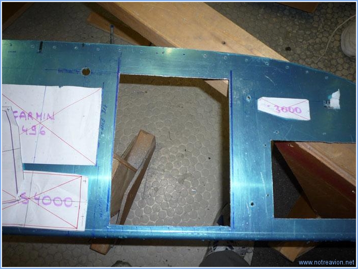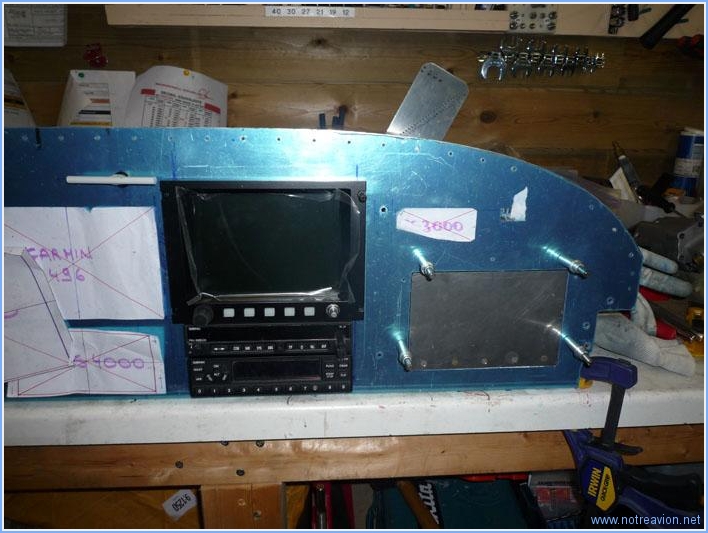 Suite du perçage du tableau de bord. Je commence par l'installation du support du GPS Garmin 496 et de l'instrumentation moteur (EIS 4000). Voici les perçages. Et voici les instruments installés. Puis je fais les perçages pour la nervure de fixation et commence le tracé pour l'EFIS coté gauche. Mais avant de faire le perçage, je décide de faire les perçages circulaires pour les trois instrument qui seront sous l'EFIS. Après le traçage, je perce tout d'abord un trou de 3/4 de pouce avec le foret étagé. Pis j'utilise le trépan à visser qui fait un perçage quasi parfait en moins de temps qu'il ne faut pour le dire. Voici le résultat avec l'indicateur de vitesse de secours. Sur le perçage du milieu on note sur le coté droit le perçage de fixation normalement prévu pour la nervure, il sera rebouché avant la peinture finale. Et pour finir, j'ai fait le perçage pour l'EFIS. Ce n'est pas encore fini, il reste les indicateurs de trim, le compas, l'intercom, le frein de parc et divers interrupteurs et voyants à placer. Temps de travail sur le sous-ensemble Aujourd'hui : 3h (Total : 35h) |