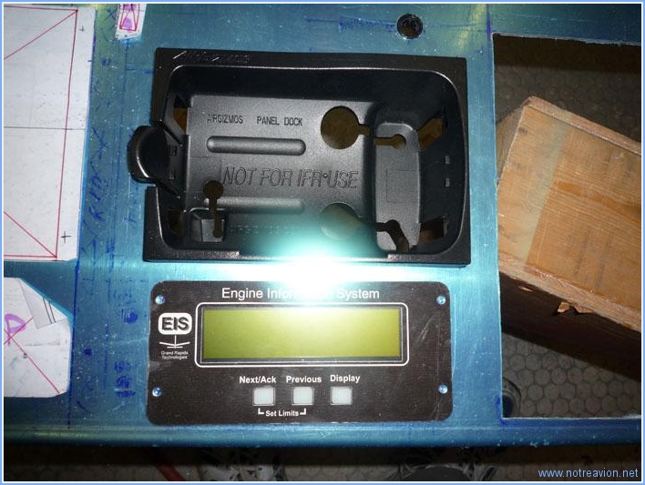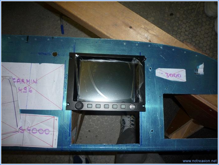 Aujourd'hui, suite du perçage du tableau de bord avec la mise en place de l'EFIS coté droit, de la radio et du transpondeur. Tout cela va un peu plus vite qu'hier, avec l'expérience il est possible de scier un peu plus près du trait final. Voici la première découpe. Après le passage de la lime sur le bord supérieur et le haut de bords latéraux, voici l'EFIS en place. Et voici le tout en place après l'ajustement du bord inférieur. Temps de travail sur le sous-ensemble Aujourd'hui : 2h (Total : 32h) |