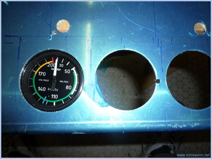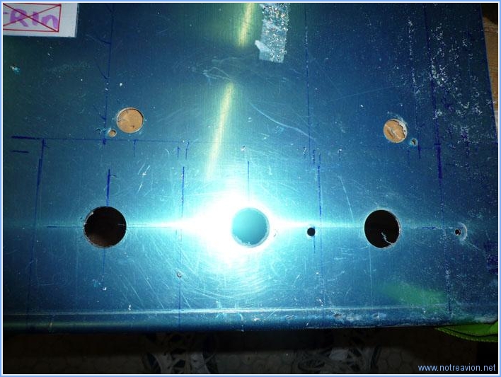 En cette nouvelle année, il faut encore faire quelques trous dans le tableau de bord. Je décide de faire les perçages pour la fixation des instruments ronds. Et je mets un temps fou pour fabriquer un gabarit qui soit satisfaisant. Une fois le gabarit fabriqué, il suffit de quelques minutes pour vérifier l'alignement et faire les perçages. Pour l'instant tout est percé à petit diamètre, le perçage à la taille définitive se fera plus tard en fonction des diamètres de vis de fixation. Puis je fais les perçages pour l'indicateur d'angle d'incidence. Et enfin les perçages pour l'intercom et le compas de secours. Temps de travail sur le sous-ensemble Aujourd'hui : 4h (Total : 39h) |