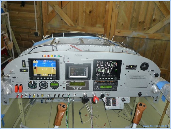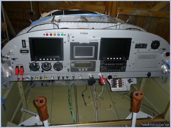 Aujourd'hui, le but était terminer le tableau de bord et de le mettre sous tension. J'ai d'abord commencé par installer les deux aérateurs. Quelques vis récalcitrantes ont allongé le temps de travail prévu. Voici une photo du tableau de bord terminé. Et voici l'ensemble branché sur le 12V. J'ai eu une petite frayeur, après la première mise sous tension, les EFIS ne se lançaient pas à cause d'un voltage trop faible et une petite odeur de chaud devenait perceptible. En fait c'est mon alimentation 12V d'atelier qui était entrain de rendre l'âme, la photo a été prise en utilisant la batterie de bord. Temps de travail sur le sous-ensemble Aujourd'hui : 2h (Total : 242h) |