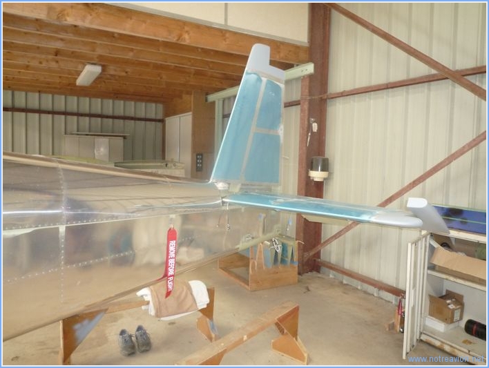 Première journée au hangar, qui commence par un peu de maintenance sur la porte, un peu de rangement, et de mise au point du compresseur présent sur place. Ensuite je commence le montage de l'empennage, quelques petites difficultés d'accès pour la mise en place des boulons. Le câble du trim de profondeur doit encore être fixé. J'ai également ré-installé l'antenne radio, c'est beaucoup plus simple avant le montage des ailes. Le travail dans le hangar est différent du travail dans l'atelier, je n'ai pas tous les outils et ils sont dans des boites à outils plutôt qu'accrochés au mur de l'atelier. Temps de travail sur le sous-ensemble Aujourd'hui : 4h (Total: 4h) |