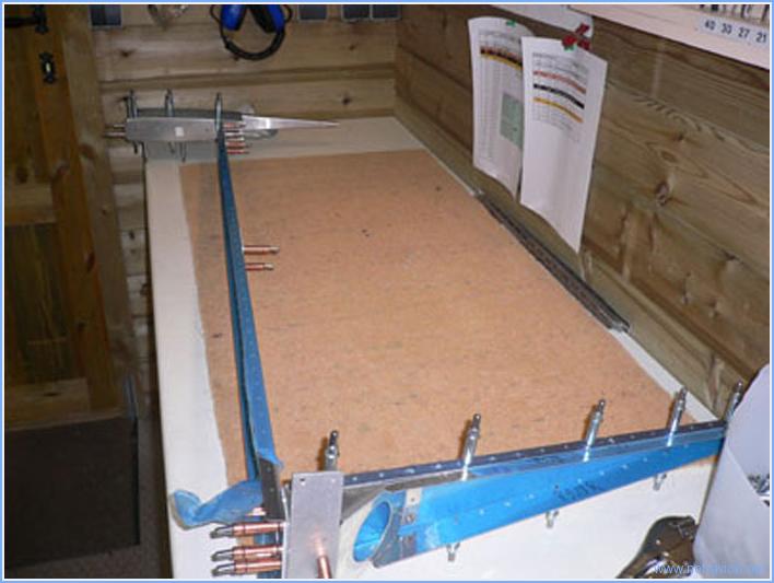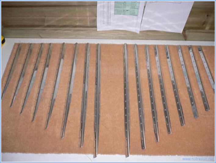 Début du travail sur la gouverne de direction. La construction commence par les raidisseurs, il y en a huit par coté. Chaque raidisseur doit être coupé à la bonne longueur, puis il y a deux découpes à faire notamment pour prendre en compte le rétrécissement vers le bord de fuite. Ensuite toutes les coupes sont adoucies avant le perçage une fois positionné sur la peau. Pour finir, début du montage du squelette, avec fabrication de quelques pièces à partir de feuilles d'aluminium brut. Temps de travail sur le sous-ensemble Aujourd'hui : 4h (Total : 4h) |