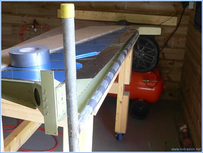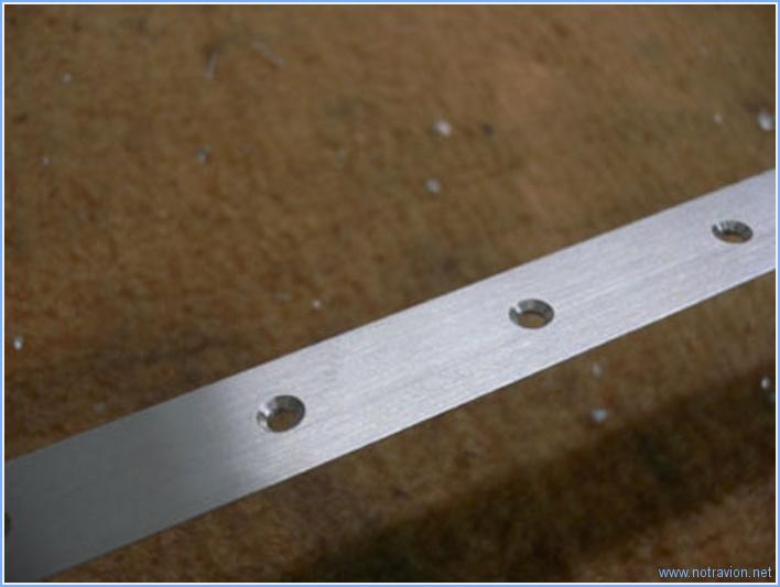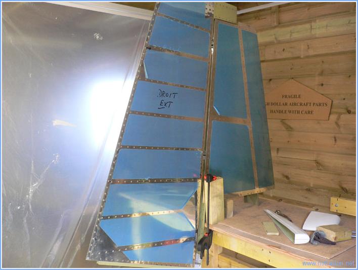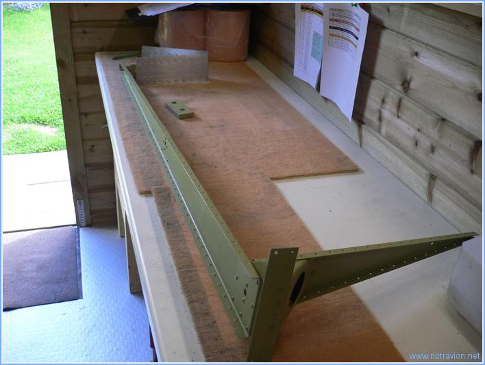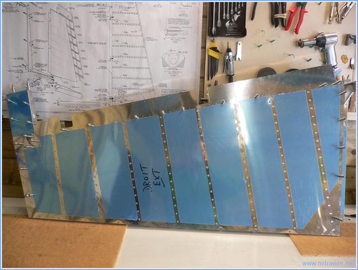 Après le rivetage des raidisseurs sur la peau, premier montage complet des peaux et du squelette. Ensuite perçage au bon diamètre de l'ensemble des trous fixant les peaux sur le squelette. Ensuite il faut tout redémonter, ébavurer tous les perçages, embréver aux emplacements prévus. Ensuite passage du squelette au Scotchbrite pour préparer la peinture. L'après-midi se termine par le fraisage de l'angle de finition du bord de fuite. Cet angle doit être fraisé des deux cotés, j'ai fabriqué un petit montage provisoire sur la perceuse à colonne pour pouvoir fraiser facilement l'angle en maintenant sa face supérieure horizontale. Temps de travail sur le sous-ensemble Aujourd'hui : 6h (Total : 14h) |