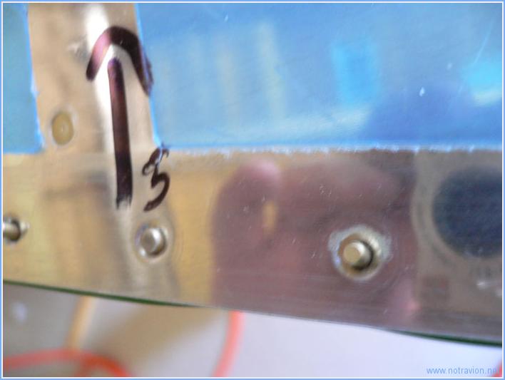 Rivetage du bord de fuite en suivant la méthode préconisée par Van's. Les rivets sont à ras sur les deux cotés du bord de fuite, la pose est un peu particulière. Sur la photo on voit la queue du rivet à moitié écrasé dans sa cuvette, l'écrasement total permet à la queue de rivet de remplir totalement la cuvette et d'avoir l'aspect d'un rivet à tête fraisée. Même si le bord de fuite n'est pas aussi droit qu'une règle, il est largement dans les tolérances (moins de 2,5mm). Le bord d'attaque doit ensuite être formé. Nous avons utilisé l'outil donné par Hervé qui permet de bien débuter, ensuite un peu de persuasion manuelle est nécessaire avant le rivetage. Et voici la direction assemblée au plan fixe vertical. Temps de travail sur le sous-ensemble Aujourd'hui : 3h (Total : 25h) |