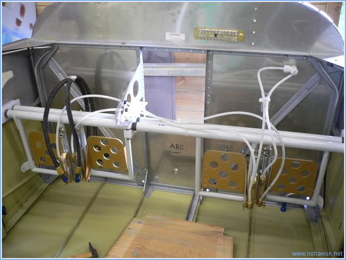 Je commence par installer la vanne de freins de parc, puis les palonniers et les pédales de freins. Ensuite je coupe tous les tubes à la bonne longueur en vérifiant qu'il n'y a pas de problème en utilisant les positions extrêmes de pédales. Voici la vanne de frein de parc avec les tuyauteries venant des pédales de la place gauche. Voici les raccord vers le réservoir de liquide de frein situé en avant de la cloison pare-feu. Ce T en plastique ne me dit rien qui vaille, le filetage est assez fragile, je pense la remplacer par un raccord de plus solide. Temps de travail sur le sous-ensemble Aujourd'hui : 2h (Total : 183h) |